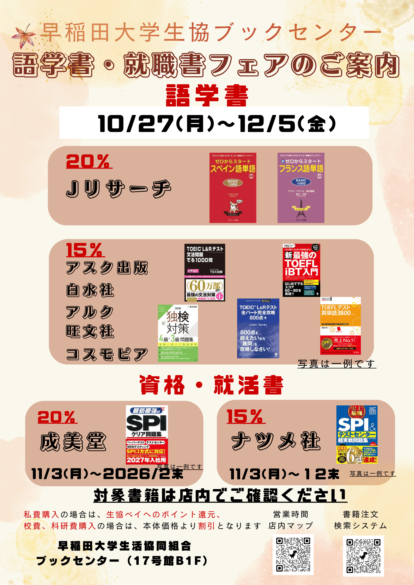 ブックセンターでは、語学書、就活書のフェアを定期的に開催しています。
