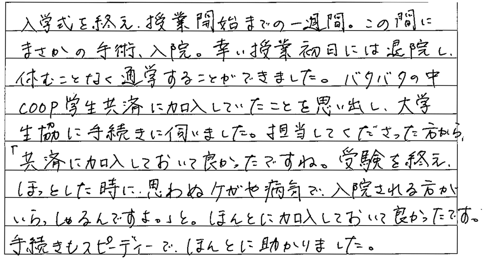 高校生である18歳まで居住区での医療費助成制度があり、病気やケガの保障には加入していませんでした。区からの助成がなくなることもあり、大学生になったら、娘の安心のために何か保障制度に加入したいと考えておりました。入学資料の生協パンフレットを初めて読み、大学生活に寄り添った保障であることが気に入りました。とはいえ、大学の学費の上に、早大生基本プランに加入すると一時的に出費が大きく、迷いもありました。