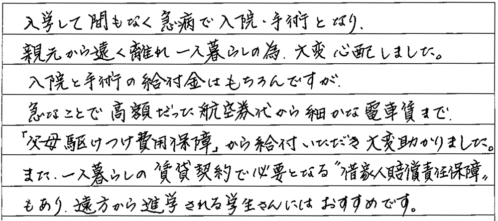 実家から通学の方でも一人暮らしの方でも、突然の入院や手術、スポーツ中のケガなど、いざという時、経済的な不安なく治療が受けられるという安心感は学生さんや保護者様にとって、大変大きいと思います。みなさまの大学生活が充実した日々となりますよう、お祈りしております。